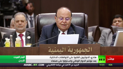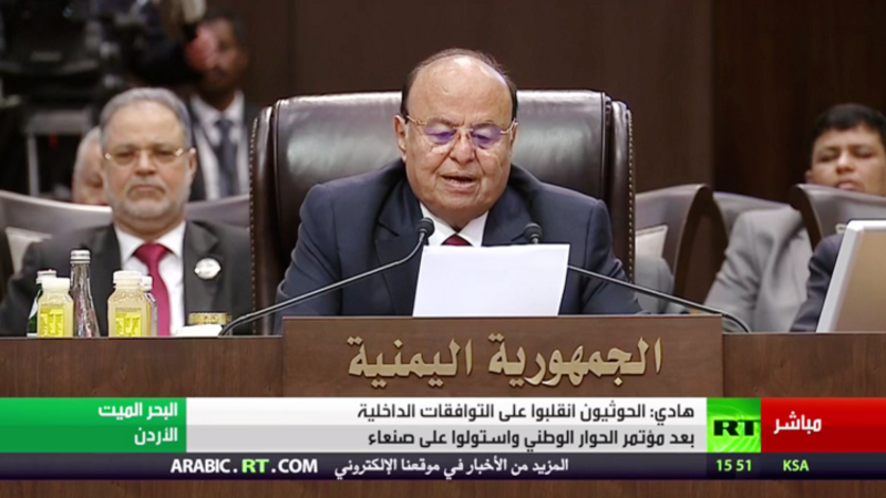 قال الرئيس اليمني عبد ربه منصور هادي في كلمة خلال افتتاح أعمال الدورة العادية 28 لمجلس جامعة الدول العربية، إن الحوثيين انقلبوا على التوافقات بعد الحوار الوطني واستولوا على صنعاء.