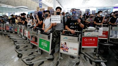 والاثنين دخلت حشود من المتظاهرين، بلغ عددهم نحو خمسة آلاف شخص بحسب الشرطة، باحة الوصول في المطار، مما حدا بإدارته إلى اتخاذ قرار نادر بإلغاء جميع الرحلات.