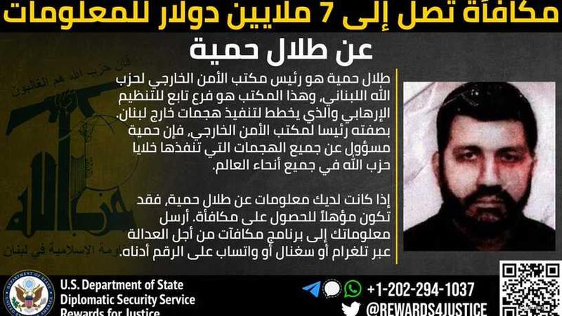 وبحسب "برنامج مكافأت من أجل العدالة" التابع لوزارة الخارجية الأميركية فإن المسؤول المعني هو طلال حمية الذي جرى تعريفه على انه "رئيس منظمة الأمن الخارجي التابعة لحزب الله اللبناني".