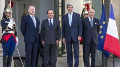وكان كيري و هيغ وصلا صباح اليوم الاثنين الى قصر الاليزيه لاجراء محادثات مع الرئيس الفرنسي فرنسوا هولاند حول الوضع السوري. ووصل هيغ وكيري بموكب كبير من سيارات الامن