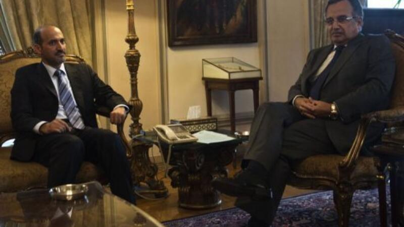 وزير الخارجية المصري نبيل فهمي (يمين) ورئيس الائتلاف الوطني السوري احمد الجربا