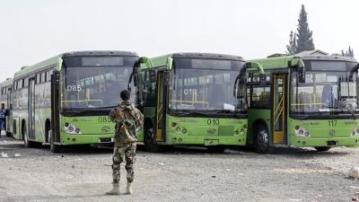 واوضح المرصد ان الحافلة وصلت الى معبر أبو الزندين قرب مدينة الباب شرقي حلب، فيما تستعد قوات الحكومة وروسيا لتهجير الدفعة الثانية.