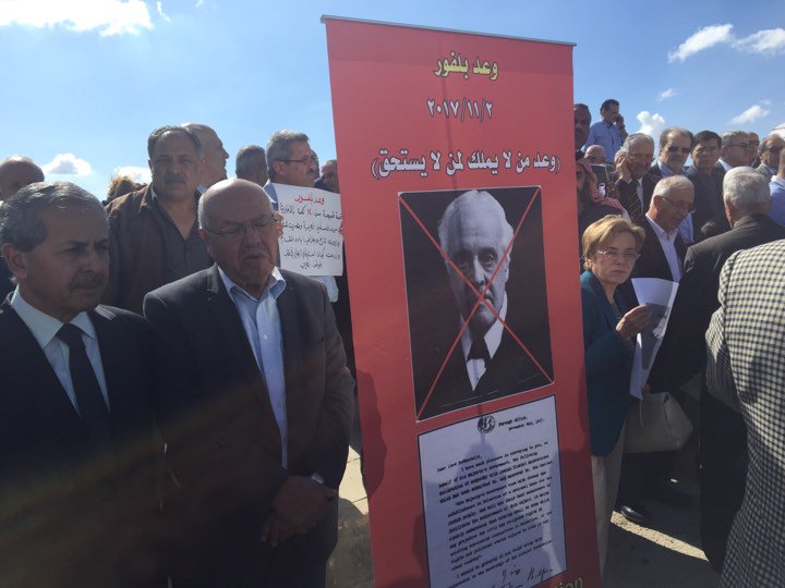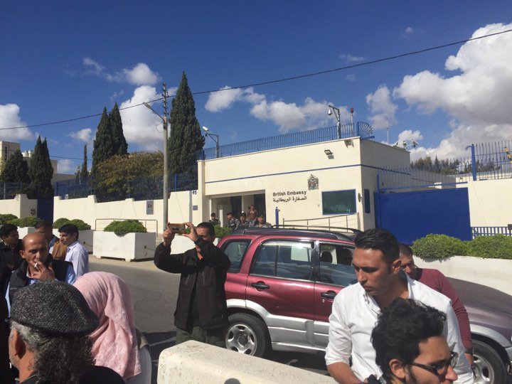 نظمت فعاليات حزبية ونقابية أردنية الخميس وقفة احتجاجية امام السفارة البريطانية في العاصمة الاردنية عمان بمناسبة الذكرى المئوية لوعد بلفور المشؤوم التي تصادف اليوم.