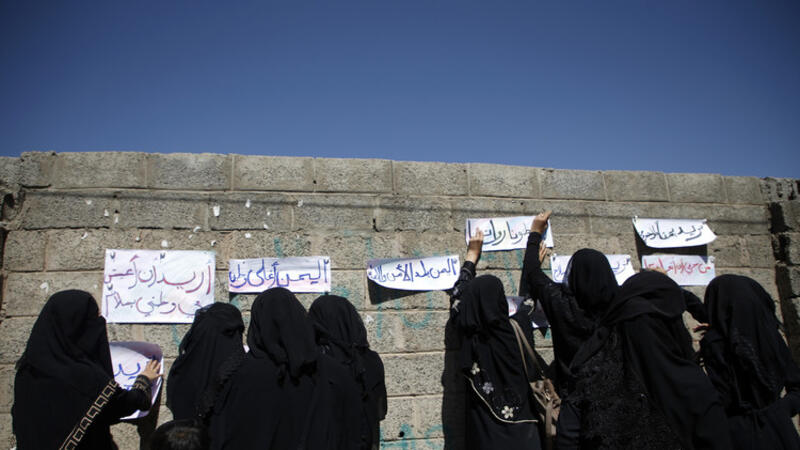 انضمت عشرات السيدات اليمنيات مع أطفالهن إلى اعتصام أمام مقر بعثة الأمم المتحدة في صنعاء للمطالبة بإنهاء الحرب في بلادهن.