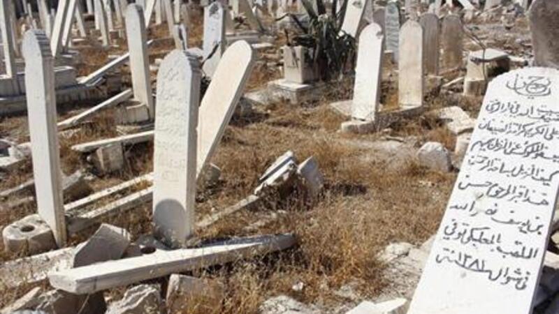 شواهد قبور محطمة في حي دوما في دمشق