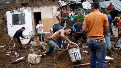ويبحث عمال إنقاذ من الصليب الأحمر والدفاع المدني والإطفاء والقوات المسلحة عن المفقودين وسط الطين وحطام المباني المنهارة.