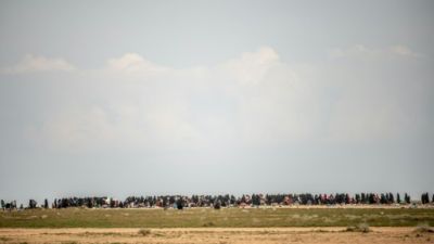 نساء وأطفال ينتظرون في حقل بعد فرارهم من الباغوز آخر معقل لتنظيم الدولة الاسلامية في سوريا