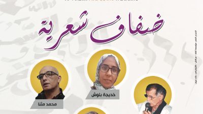 ستشهد فقرة ضفاف شعرية مشاركة الشعراء: خديجة بلوش، محمد اجغاغ، عمر الراجي، محمد مثنا، فيما يسهر على تقديم ضفاف الفنان ابراهيم بن الرايس.