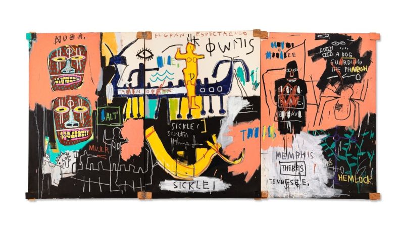 البوابة - باعت دار كريستيز، للمزادات العالمية، فى لندن، لوحة قماشية بعرض 12 قدمًا من تصميم جان ميشيل باسكيات التى يعود تاريخها إلى عام 1983، بـ 67 مليون دولار، وبهذا أصبحت اللوحة ضمن أغلى قطع الفنان التي تم بيعها للجمهور على الإطلاق.