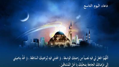 دعاء اليوم التّاسع من رمضان : اَللّـهُمَّ اجْعَلْ لي فيهِ نَصيباً مِنْ رَحْمَتِكَ الْواسِعَةِ، وَاهْدِني فيهِ لِبَراهينِكَ السّاطِعَةِ، وَخُذْ بِناصِيَتي اِلى مَرْضاتِكَ الْجامِعَةِ، بِمَحَبَّتِكَ يا اَمَلَ الْمُشْتاقينَ .