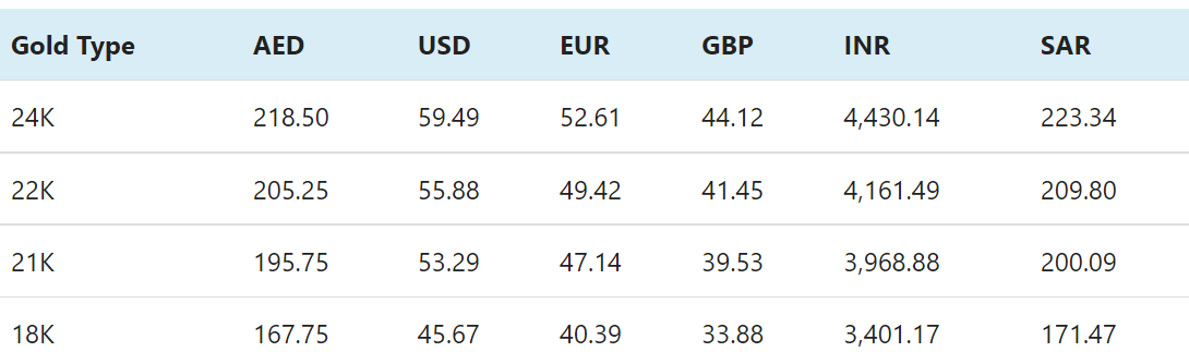 • سجل سعر الجرام عيار 24 نحو 218.50 درهم إماراتي