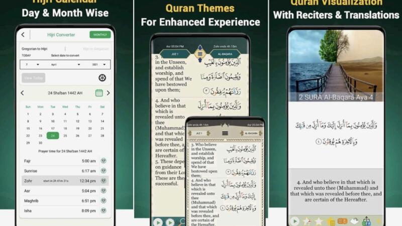 تطبيق القرآن المجيد من أشهر تطبيقات قراءة القرآن،ويضم معلومات متعلقة بالصلاة مثل اتجاه القبلة ومواعيد الصلوات، والأدعية، ومواقع المساجد القريبة،والعديد من الخدمات الدينية الأخرى.