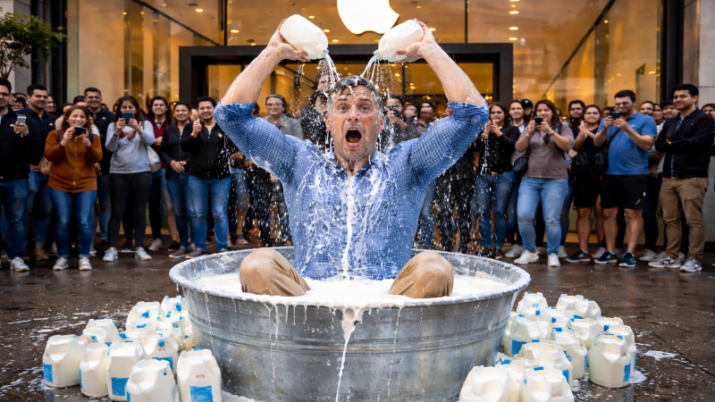 • رجل يستحم بالحليب أمام متجر آبل ويثير الجدل