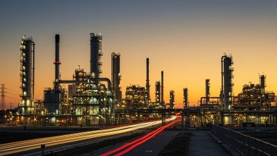 صورة خارجية لمنشأة طاقة صناعية مستقبلية عند غروب الشمس، تُظهر مصفاة نفط متقدمة بتفاصيل معقدة.