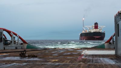 قارب جرّ وسحب ودعم (AHTS) أثناء عمليات التموضع الديناميكي (DP) بالقرب من ناقلة تخزين وإنتاج عائمة (FPSO). تقوم السفينة بعملية سحب ثابت…