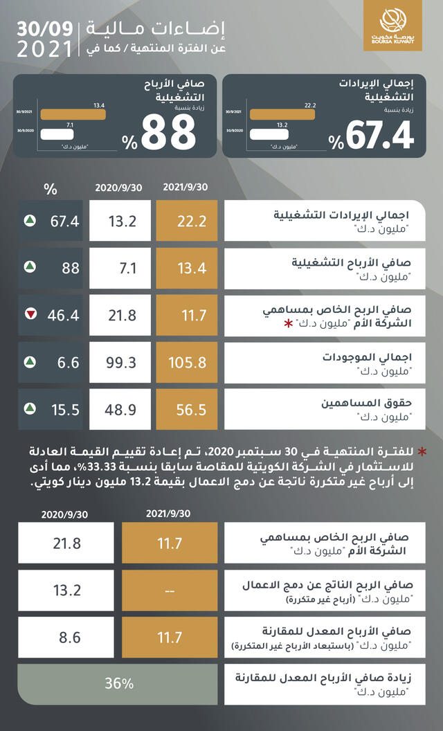 وأعلنت الشركة عن تحقيق أرباح صافية بقيمة 11.7 مليون دينار كويتي لفترة التسعة أشهر المنتهية في 30 سبتمبر 2021، والتي جاءت بعد تحول الاستثمار بالشركة الكويتية للمقاصة من شركة زميلة إلى شركة تابعة ودمج بياناتها المالية في الربع الثالث من عام 2020، حيث نتجت إعادة تقييم القيمة العادلة للاستثمار عن أرباح غير متكررة بقيمة نحو 13.2 مليون دينار كويتي، والتي ساهمت في تحقيق صافي ربح قدره 21.8 مليون دينار كويتي للفترة المقارنة من العام 2020. وباستبعاد الأرباح غير المتكررة، سجل صافي الربح للفترة الحالية زيادة بنسبة 36% من 8.6 مليون دينار إلى 11.7 مليون دينار كويتي.