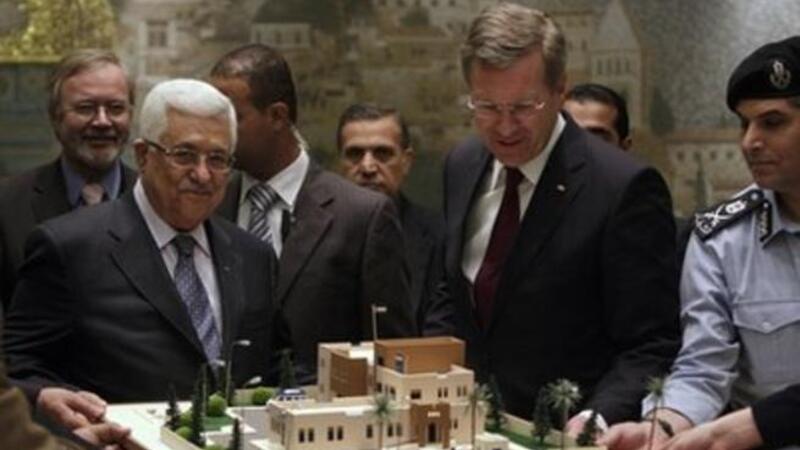 عباس (يسار) والرئيس الالماني يستعرضان مجسما لمركز شرطة تمول المانيا اقامته خلال لقائهما في رام الله
