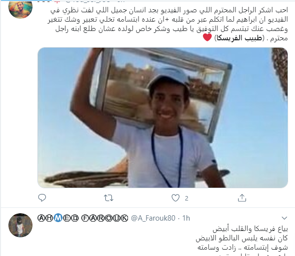 وبعد سماع قصة بائع "الفريسكا"، سارع روّاد مواقع التواصل الاجتماعي الى إعادة نشر الفيديو مؤكدين بأنه مصدر إلهام لكثيرين باجتهاده وتفوقه خصوصًا في مُساعدة والده، واعتبروه بحق نموذجًا مُشرفًا لأبناء مصر النابغين.