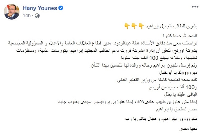 وانتفضت الحكومة المصرية لمُساعدة الشاب، وكتب هاني يونس المُستشار الإعلامي لمجلس الوزراء على صفحته الشخصية بـ"فيسبوك"، أنه تواصل مع الطالب المجتهد، وأبلغه بقبول وزير التعليم العالي خالد عبدالغفار حصوله على منحة كاملة لدراسة الطب بجامعة الإسكندرية.
