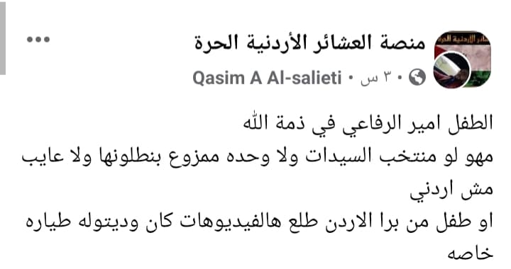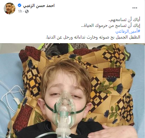 وأعلن محمد الرفاعي والد الطفل أمير وفاة ابنه الليلة الماضية في مستشفى الأميرة رحمة للأطفال في محافظة إربد شمالي العاصمة عمان عن عمر يناهز الـ12 عامًا.