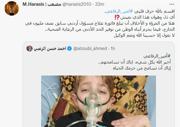 وأشار الرفاعي، الذي يعمل عامل مياومة في مخبز، أن جميع الأطباء في المستشفى رفضوا كتابة تقرير طبي بعدم توفر علاج له في الأردن وظل أمير يعاني حتى توفاه الله.