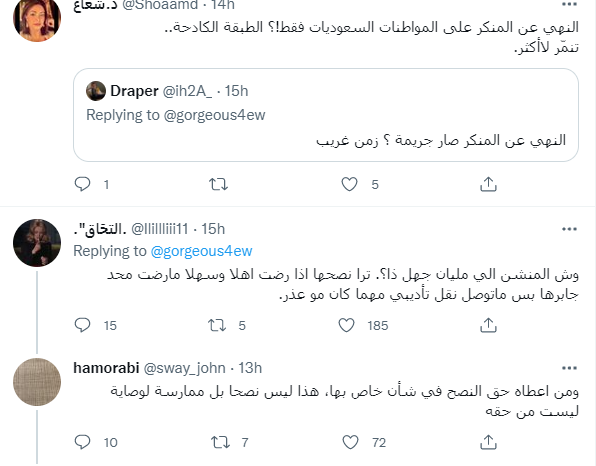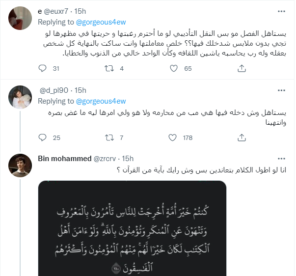 وكتبت سيدة أخرى: "لو أنا محجبة ولابسه عباية عادية ومقفلة وداخلة أراجع في دائرة حكومية وواحد يعاملني بإهانة مثل كذا !!!! وربي أشتكيه واعلمه الأدب عشان يحترم كل المراجعين، يعنى ليش يوجه لي كلام زي كذا امام الكل مع انه لما يطلع الشارع مليان محجبات ولا يجرى وراهم ينصح".