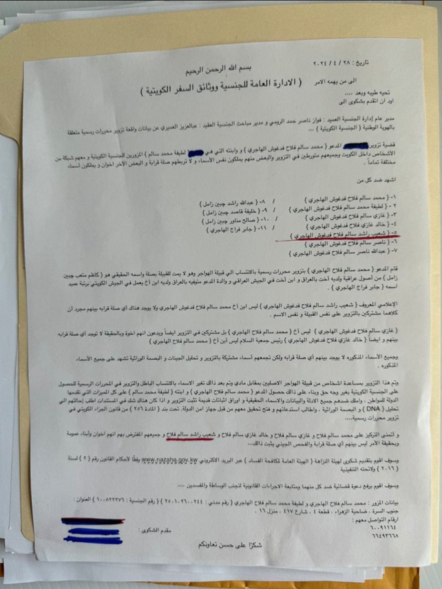 ووفقًا للوثيقة المتداولة في منصات التواصل الاجتماعي، فقد خاطب صاحب الشكوى مدير عام إدارة الجنسية العميد فواز ناصر حمد الرومي، ومدير مباحث الجنسية العقيد عبد العزيز العميري بشأن تورط مجموعة من الأشخاص بـ تزوير الجنسية الكويتية، من بينهم الإعلامي الشهير شعيب راشد.
