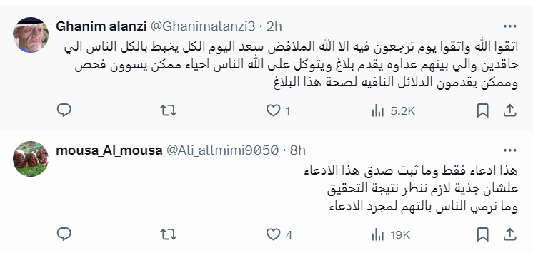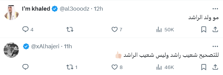 التغريدة الأولى: "والد الإعلامي شعيب راشد هو عراقي الجنسية واسمه الحقيقي (كتاب) وهو متوفي، جاء من العراق وانتسب لقبيلة الهواجر بالباطل لكي يحصل على الجنسية".