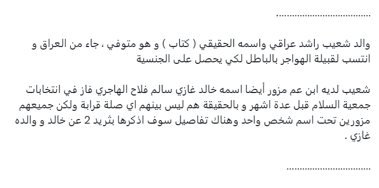 التغريدة الثانية: "شعيب لديه ابن عم مزور أيضًا اسمه خالد غازي سالم فلاح الهاجري فاز في انتخابات جمعية السلام قبل عدة أشهر وبالحقيقة هم ليس بينهم أي صلة قرابة ولكن جميعهم مزورين تحت اسم شخص واحد".