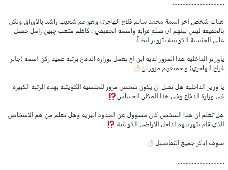 وذكرت الوثيقة أن المدعو (محمد سالم فلاح فدعوش الهاجري)، وابنته التي هي لطيفة محمد سالم (المزورين للجنسية الكويتية ومعهم شبكة من الأشخاص داخل الكويت وجميعهم متورطين في التزوير والبعض منهم يملكون نفس الأسماء ولا تربطهم صلة قرابة والبعض الآخر أخوان ويملكون أسماء مختلفة تمامًا. (حسب الوثيقة)