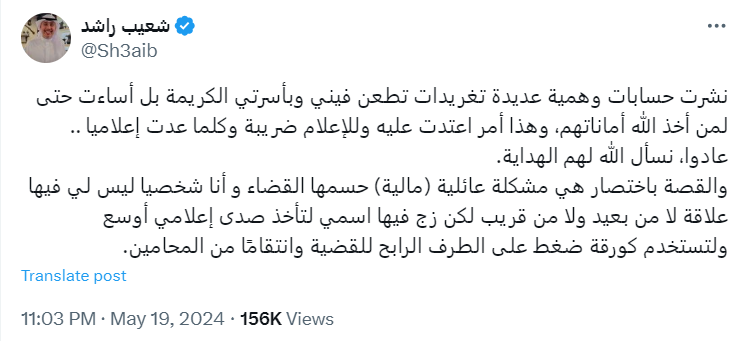وتوجه شعيب راشد نحو حسابه الرسمي في منصة "إكس"، تويتر سابقًا، للتعليق على الأنباء المتداولة، والمدعومة بوثيقة رسمية تتضمن مطالبات بمحاسبة كل من زوّر جنسيته الكويتية؛ من بينهم الإعلامي الشهير.