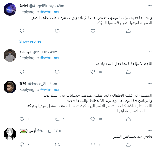 وكتب أحد المغردين: "المصيبة أن أغلب الأطفال والمراهقين عندهم حسابات في التيك توك والبرنامج هذا يوم بعد يوم يزيد الانحطاط والسفالة فيه اللي مثل هالاشكال تستحق التىْمر الين تكره شي اسمه سوشل ميديا وتتركه عشان ما تنشر قذارتها".