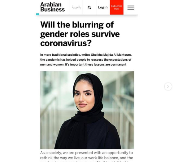 ونشرت الشيخة ماجدة تقريرًا على موقع "آريبيان بيزنس-Arabian Business" مطلع شهر أكتوبر الماضي بعنوان "هل ينجو التعتيم في أدوار الجنسين من فيروس كورونا؟"