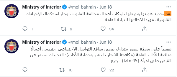 وجاء في تغريدتين متتاليتين لوزارة الداخلية البحرينية: "تعقيبًا على مقطع مصور متداول ببعض مواقع التواصل الاجتماعي ويتضمن أعمالًا منافية للآداب العامة (مكافحة الاتجار بالبشر وحماية الآداب): التحريات تسفر عن القبض على امرأة (45 عامًا)".
