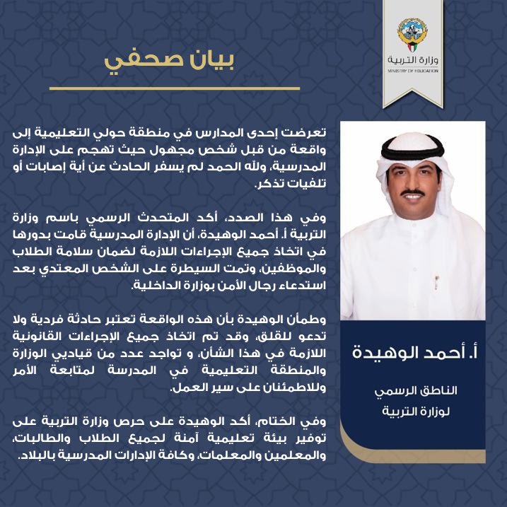 وكانت وزارة التربية الكويتية قد أوضحت في وقت سابق أن شخص مجهولًا تهجم على إدارة مدرسة في منطقة حولي التعليمية.