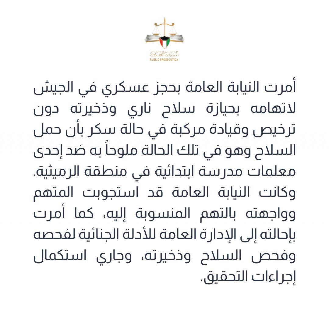 ونشر الحساب الرسمي للنيابة العامة في دولة الكويت، عبر منصة "إكس"، بيانًا رسميًا حول الإجراء المُتخذ بحق العسكري المُتهم.