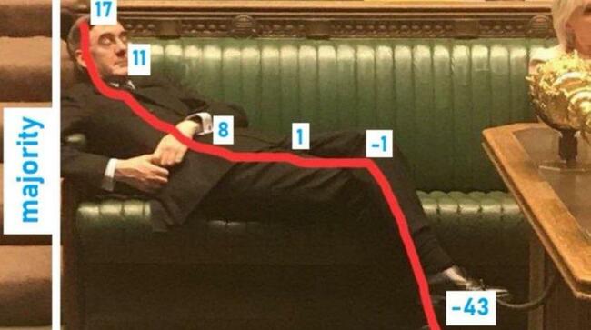ومن أشهر هذه الصور الساخرة التي تم تداولها بشكل واسع على "تويتر"، تلك الصورة التي ظهر فيها موغ مستلقيا ليشكّل مؤشرًا لتراجع الأغلبية البرلمانية لحزب المحافظين خلال السنتين الأخيرتين.
