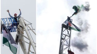 A 69 year old, Nick Georges has risked his life climbing a 650ft crane and planting a Palestinian flag on it next to the US embassy.