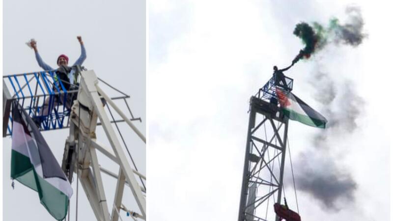 وتسلق "نيكولاس جورج" (69 عامًا) رافعة بناء بالقرب من سفارة الولايات المتحدة في لندن يبلغ طولها أكثر من 200 مترًا والمكوث هناك 30 ساعة في الهواء الطلق للفت أنظار العالم اتجاه القضية الفلسطينية.