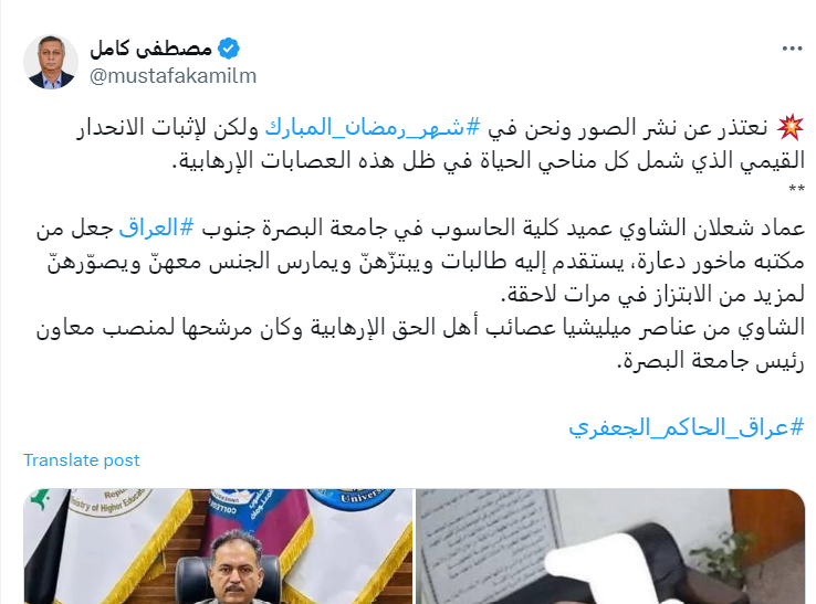 وأشار النشطاء إلى اسم الأكاديمي العراقي، وذكروا بأنه يتبوأ منصب عميد كلية الحاسوب وتكنولوجيا المعلومات في جامعة البصرة.