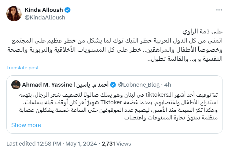 في المقابل، شنّ نشطاء في لبنان حملة واسعة للمطالبة بحظر تطبيق تيك توك في الوطن العربي، باعتباره وسطًا خصبًا للترويج لـ"الدعارة" و"المخدرات" و"الاعتداء الجنسي على الأطفال والقُصر".