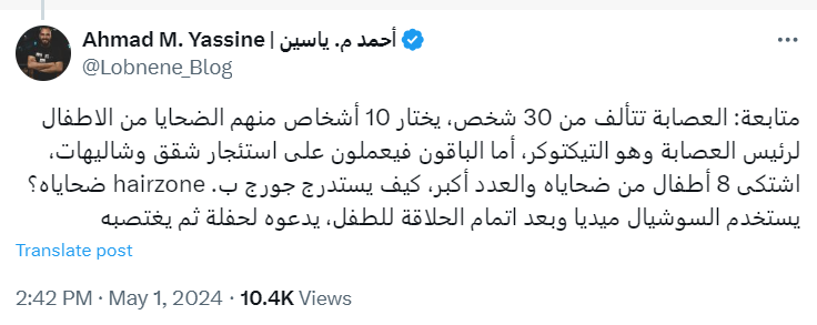وذكر الإعلامي اللبناني أحمد يس، عبر حسابه الرسمي في منصة "إكس"، أن أعضاء العصابة يقسمون المهام عليهم، إذ يكلف 10 منهم باستدراج الأطفال وتقديمهم لتيكتوكر المشهور، فيما يتولى الآخرون ممة البحث عن شقق وشاليهات لاستئجارها لتنفيذ جرائهم المروعة.