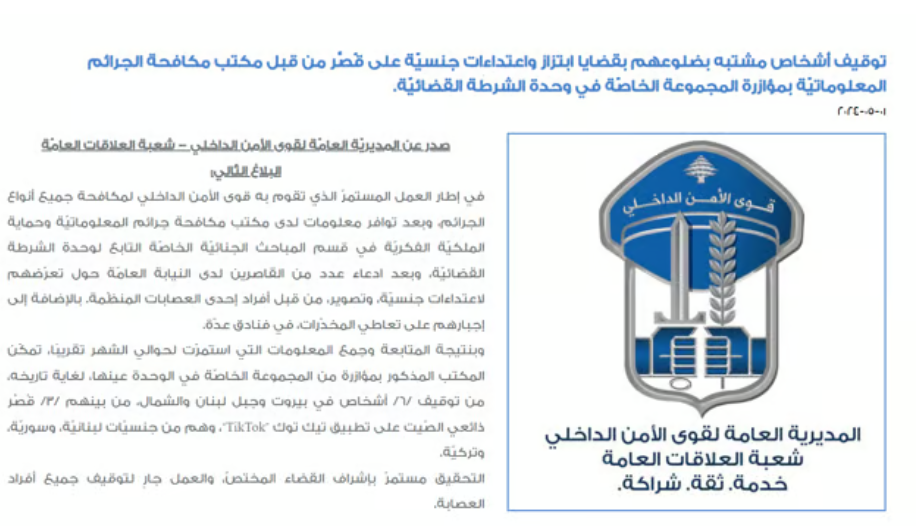 وأعلنت قوى الأمن الداخلي توقيف 6 أشخاص في بيروت وجبل لبنان والشمال، بينهم 6 قُصّر ذائعي الصيت في تطبيق تيك توك، وذلك بعد المتابعة وجمع المعلومات التي استمرت لحوالي الشهر تقريبًا، تمكّنت القوى المختصة من "توقيف 6 أشخاص في بيروت وجبل لبنان والشمال.
