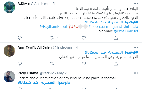 وشارك آلاف عبر الوسم، رفضوا أي عبارات سخيفة وعنصرية توجه إلى لاعب الزمالك محمود عبد الرازق شيكابالا، وكتب سعد: "أحرف وأمهر من أنجبت كرة القدم المصرية على مر العصور الساحرمحمود عبدالرازق شيكابالا المفترى عليه.. جمهور الزمالك معاك وبيدعمك يا بطل".