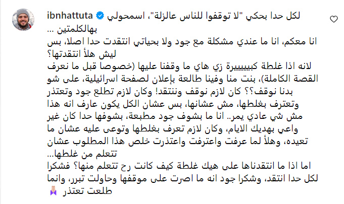 من جهته، علق الرحالة ابن حتوتة على فيديو جود قائلًا: "أنا معكم، أنا ما عندي مشكلة مع جود ولا بحياتي انتقدت حدا، بس ليش هلأ انتقدتها؟ لأنه إذا غلطة كبيييييرة مثل هذه ما وقفنا عليها (خصوصًا قبل ما نعرف القصة الكاملة)، بنت منا وفينا طالعة بإعلان لصفحة إسرائيلية، على شو بدنا نوقف؟؟ كان لازم نوقف وننتقد! وكان لازم تطلع جود وتعتذر وتعترف بغلطها، مش عشانها، بس عشان الكل يكون عارف انه هذا مش شي عادي يمر.. انا ما بشوف جود مطبعة، بشوفها حدا كان غير واعي بهديك الايام، وكان لازم تعرف بغلطها وتوعى عليه عشان ما تعيده، وهلأ لما عرفت واعترفت واعتذرت خلص هذا المطلوب عشان تتعلم من غلطها…أما إذا ما انتقدناها على هيك غلطة كيف كانت رح تتعلم منها؟ فشكرا لكل حدا انتقد، وشكرًا جود انه ما اصرت على موقفها وحاولت تبرر، وإنما طلعت تعتذر".