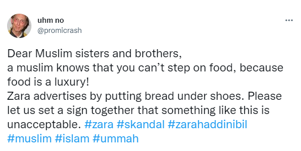 وعبر وسم ZaraHaddiniBil#، والتي تعني باللغة العربية "زارا الزمي حدك"، طالب رواد موقع التدوين "تويتر" في تركيا من الشركة الإسبانية سحب إعلانها الأخير وتقديم اعتذار رسمي لشعب يحترم الخبز الذي يأكله.