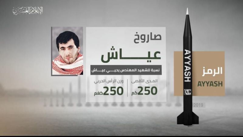 و صاروخ عياش " AYYASH" ، ويعد الصاروخ أقوى الصواريخ التي أنتجتها الكتائب من حيث القدرة التدميرية ، إذ يزن رأسه الحربي 250 كغم ، في حين يبلغ مداه 250 كلم ، وسمي تيمنا بالشهيد يحيى عياش .