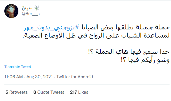 ودشنت مجموعة من الفتيات وسمًا يحمل اسم "#تزوجني_بدون_مهر" لتشجيع الشباب على الزواج أملًا في الحد من العنوسة في الوقت الذي تشهد فيه بلادهم أزمة اقتصادية غير المسبوقة دفعت الشباب إلى العزوف عن الزواج لعدم قدرتهم على تحمل تكاليف الزواج والنفقات الأخرى.