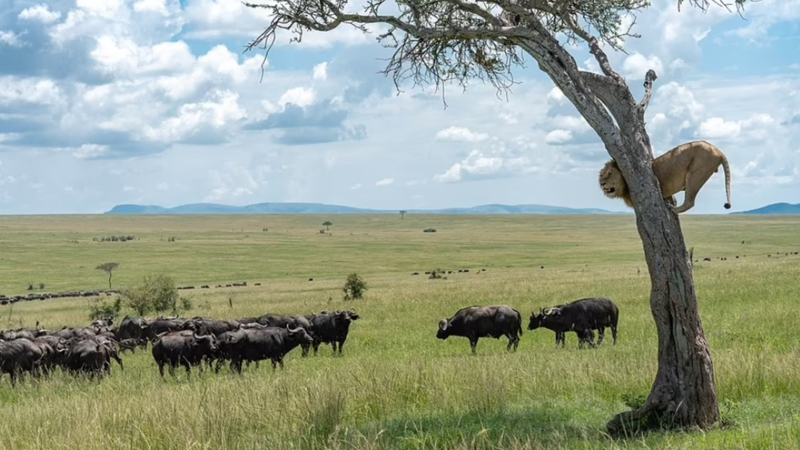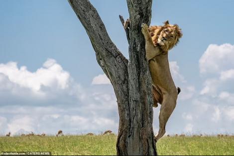 وتشبث الأسد بفرع الشجرة بعد أن أخطأ في محاولة ملاحقة القطيع في ماساي مارا بكينيا، عندما رأى الجاموس الأسد يقترب، استدار وطارده ، مما أجبره على صعود الشجرة لساعات.