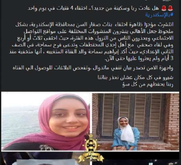 ونفت وزارة الداخلية، في بيان رسمي، ما تداولته بعض الصفحات على شبكة الإنترنت، من ادعاءات حول تعدد حالات اختفاء الفتيات بالإسكندرية.